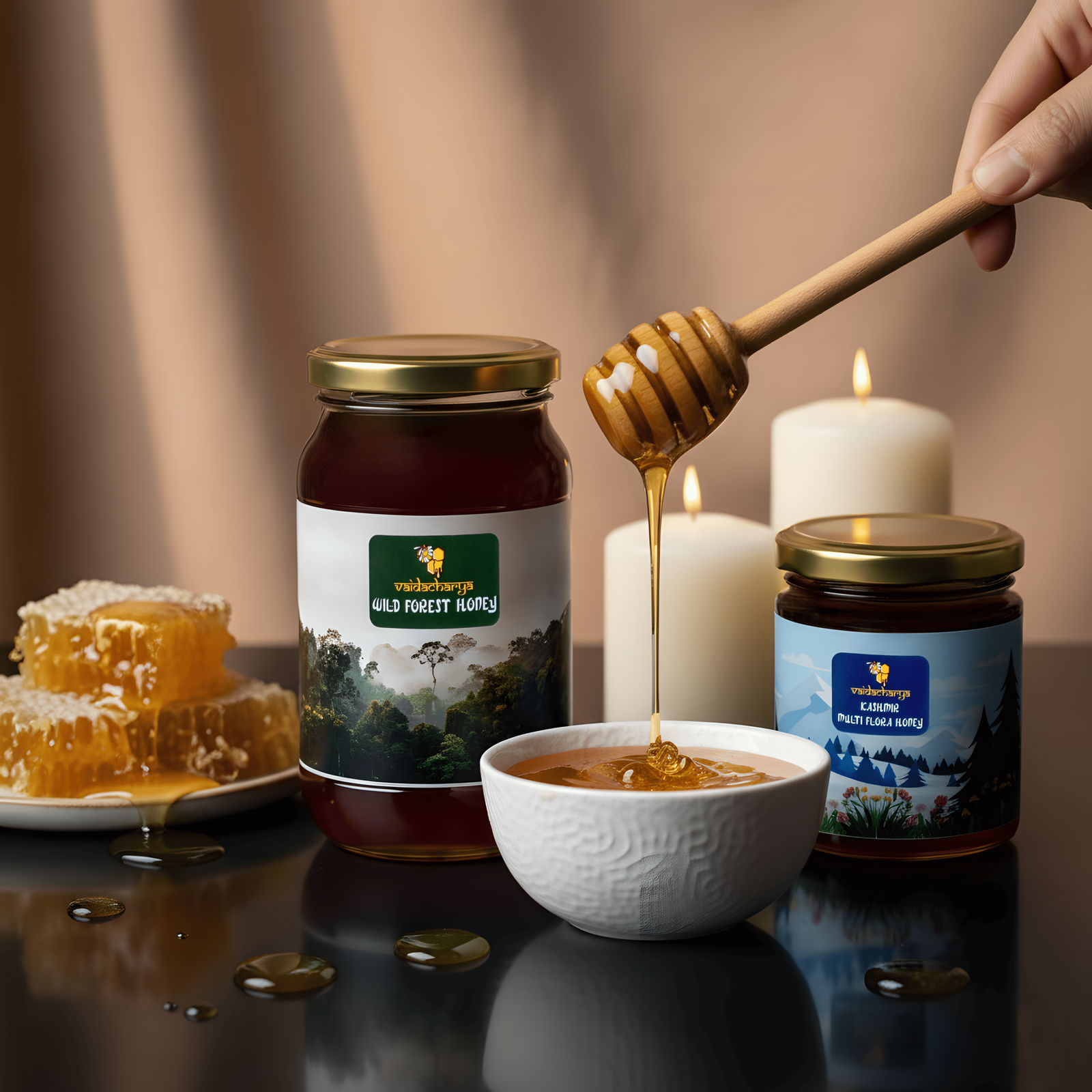 Combo pack: Kashmir Multi Flora Honey (250ml) + Wild Forest Honey (500ml). Perfect blend of floral and forest richness for daily wellness and gifting.
